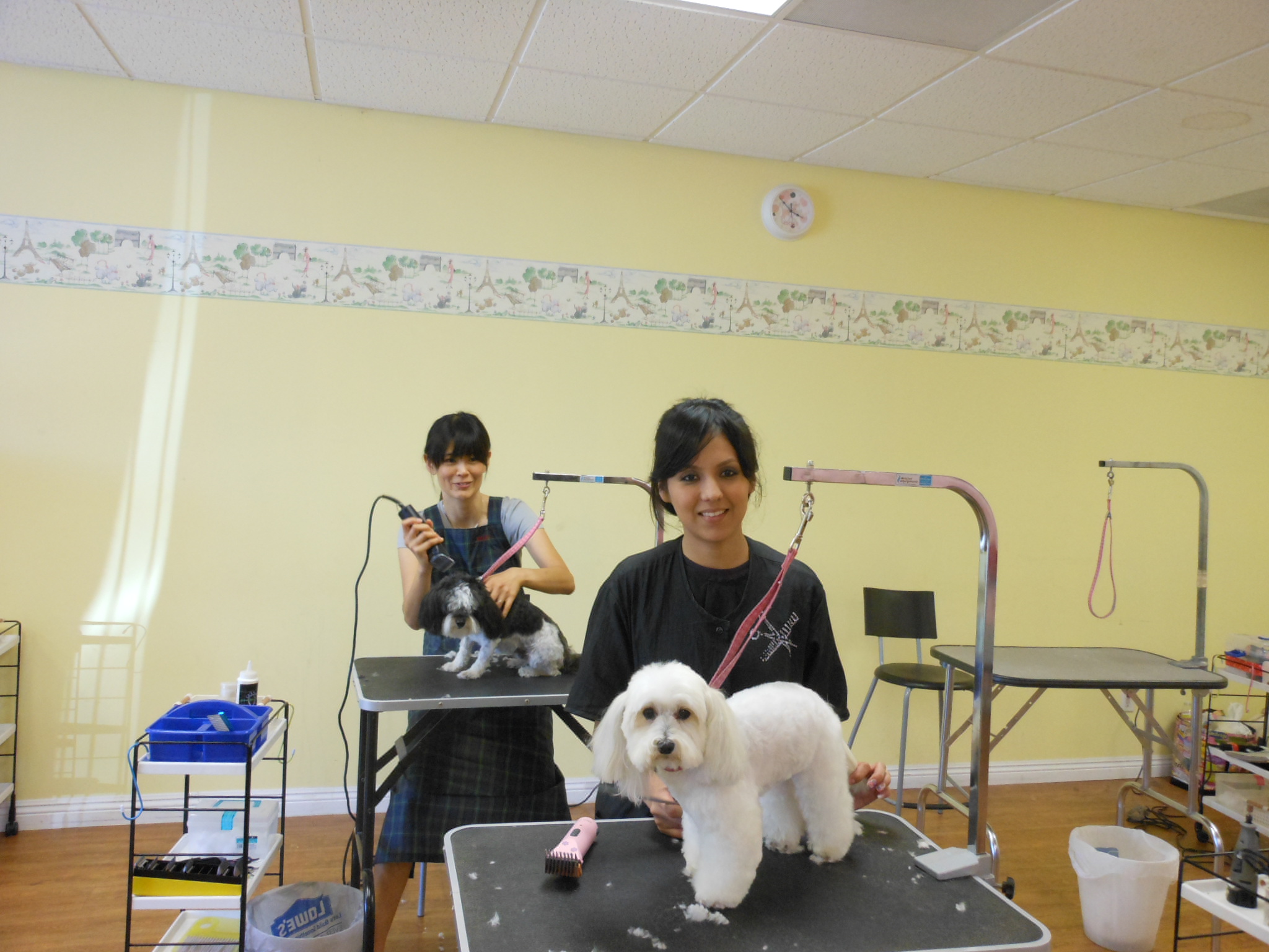 金井さんは卒業後、ロスにわたり山田かおり先生が主催される4DOGS GROOMING ACADEMYでアメリカのグルーミングを学び、そして今はロス近郊のトーランスにあるサロンを任されて、グルーマーとして活躍し、休日は美容コンテストに挑戦したり、ドッグショーでスタンダードプードルをハンドリングして勉強を重ねているそうです。写真のお店は姉妹店です。どちらのお店も同じ壁画が描かれています。かわいい~~♡